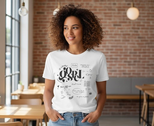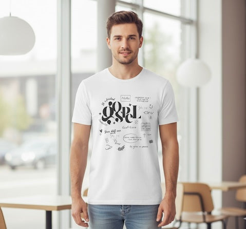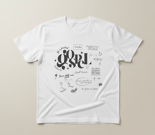 This T-shirt features a minimalist and artistic black-on-white design centered around a Christian theme. The main focal point is the bold, stylized word "Gospel" in the center, surrounded by handwritten words, doodles, and small illustrations that resemble notes from a journal or Bible study.